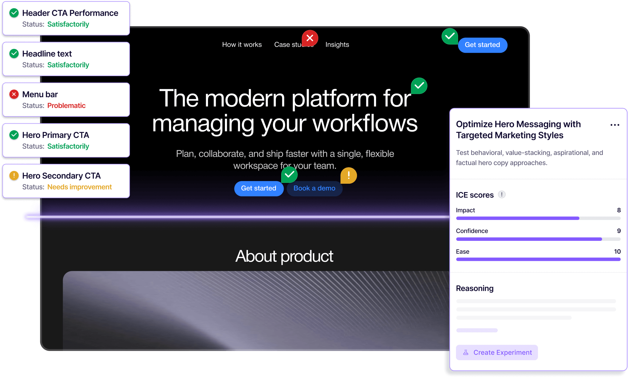 Copy, CTAs, social proof placement, trust signals, urgency elements, product descriptions, layout changes, and more.