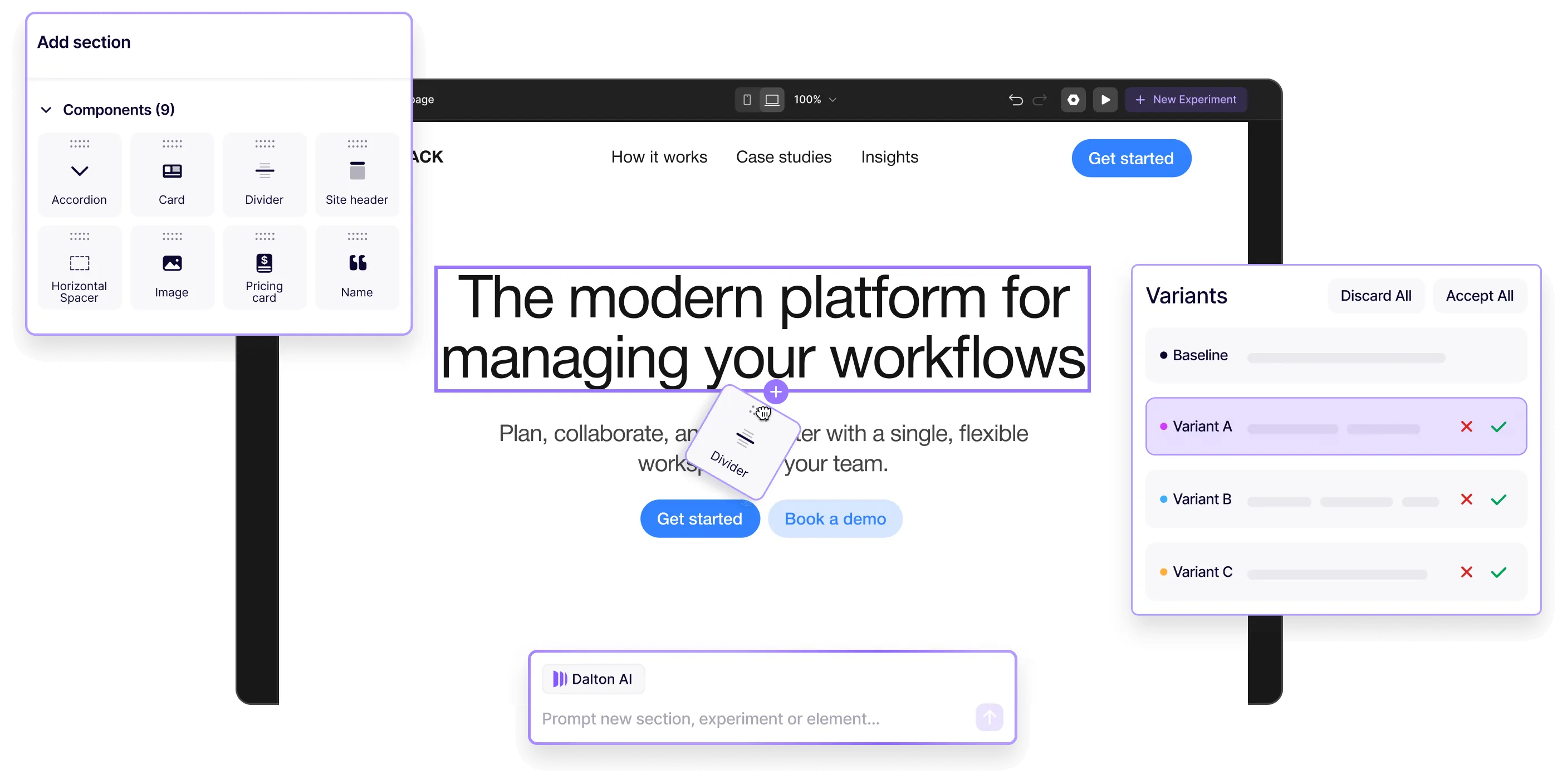 "Classic A/B testing wasn’t realistic: not enough traffic, and no team to manage it. Dalton made it simple to run smart & fast experiments at scale without new hires. In 1 week we already found a tagline that converts 10% better that we now use in all marketing assets."